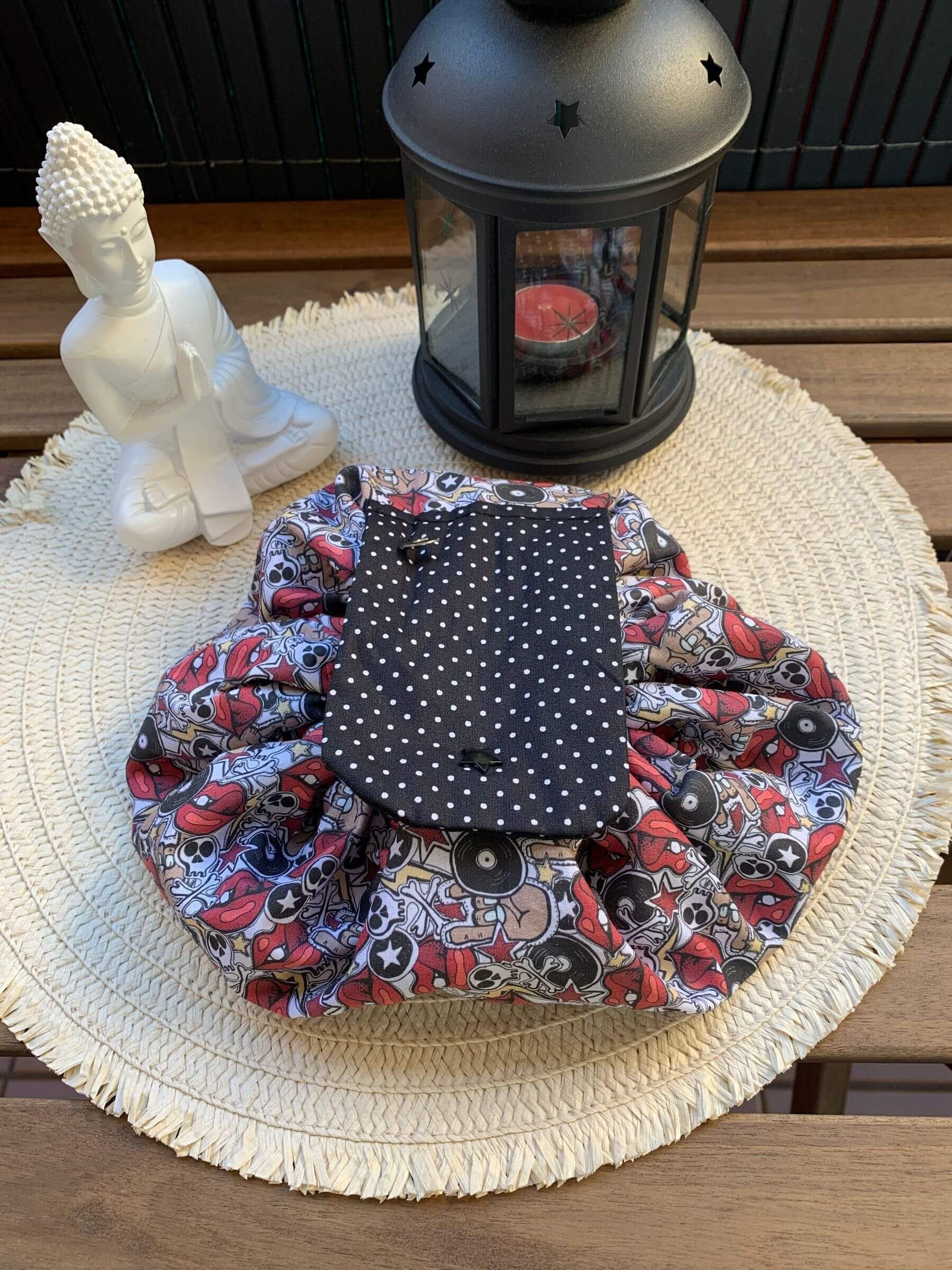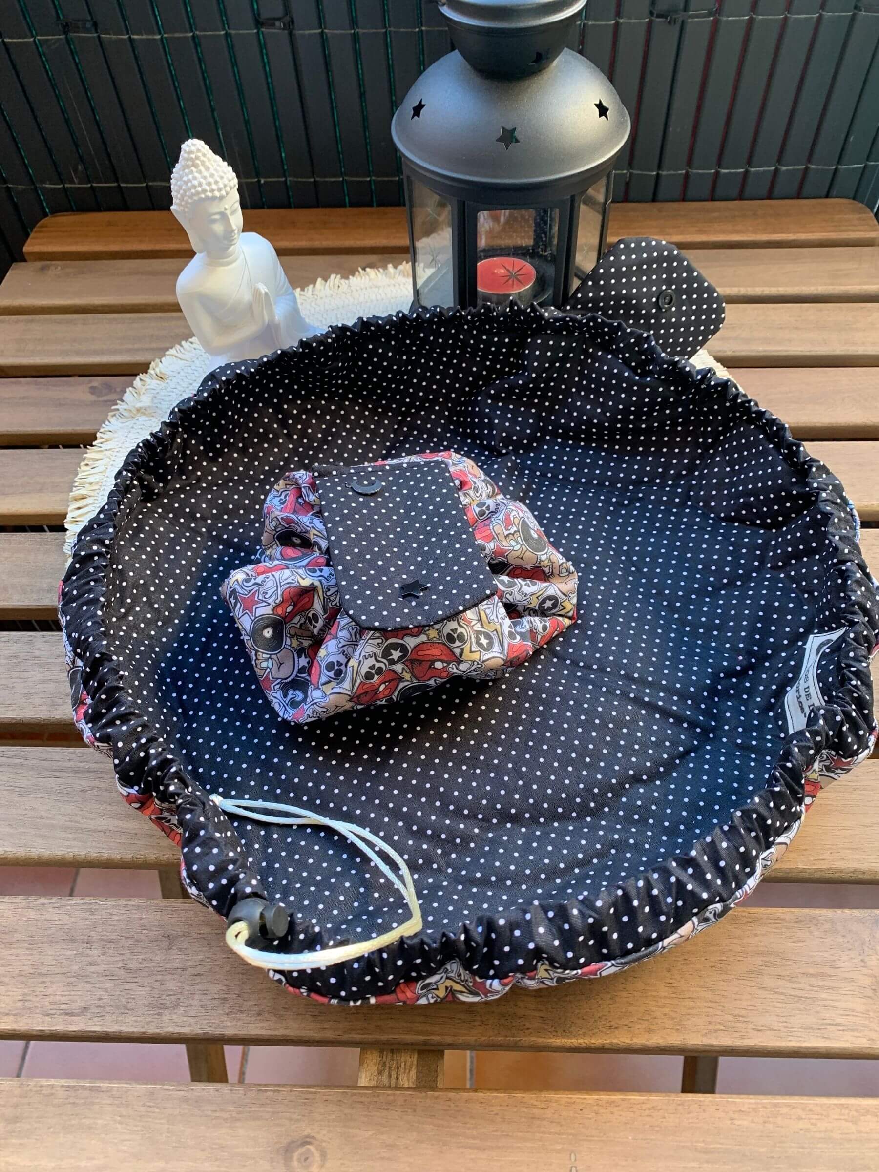 Está hecho en tela de algodón estampada, siempre se busca una combinación que quede bonita.